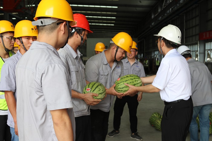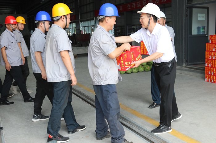 王拯民書記深入車間向一線職工發(fā)放了清涼飲料、西瓜等慰問品,同時向職工們轉(zhuǎn)達(dá)了集團(tuán)對大家的關(guān)懷和問候,他叮囑大家在高溫季節(jié)一定要做好防暑降溫工作,提高自我保護(hù)意識和防范能力,確保平安度夏。