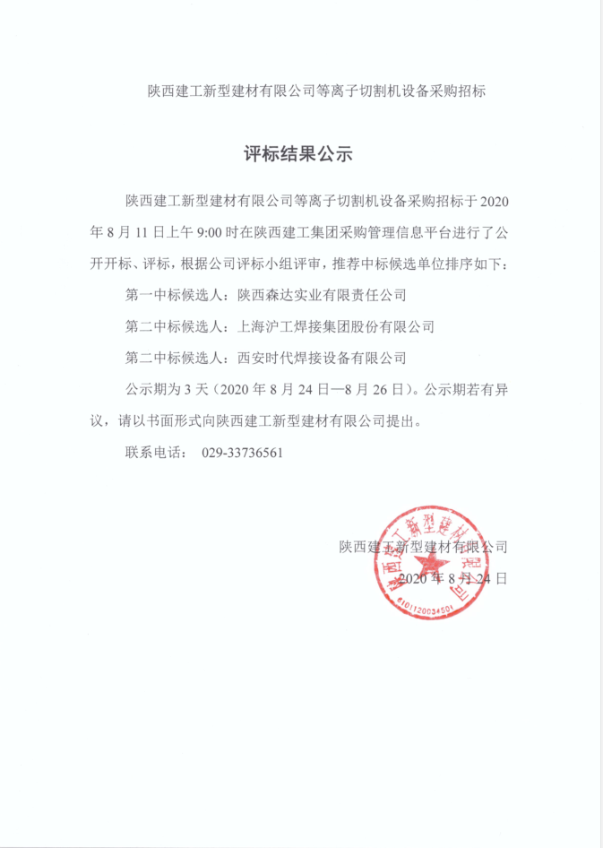 | 陜西建工新型建材有限公司等離子切割機(jī)設(shè)備采購招標(biāo) |