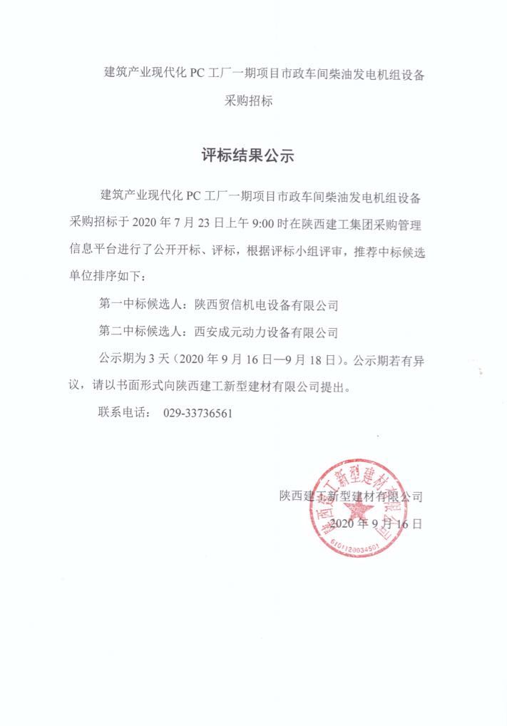 | 建筑產(chǎn)業(yè)現(xiàn)代化PC工廠一期項(xiàng)目市政車間柴油發(fā)電機(jī)組設(shè)備采購招標(biāo)結(jié)果公示 |