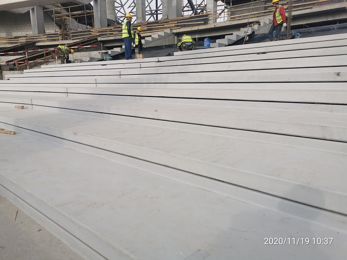 蘭州項目預制看臺的制作、安裝均由我司承擔,公司組織專業(yè)技術人員針對蘭州項目進行深入地研討分析,據了解,該項目的安裝控制難點共有4點: 一是施工條件復雜;項目現場涉及與各方施工配合及交叉作業(yè),施工條件復雜,由于工期緊張,主體結構,鋼結構,預制看臺安裝同步施工,給整個預制看臺安裝帶來極大挑戰(zhàn),尤其是測量放線工作,看臺安裝前需提前進行精準放線定位以便于吊裝精準定位,但預制構件與現澆交叉施工工序原因,部分位置施工現場已經進行現澆處理,但該位置恰好遮擋預制構件放線視線,導致現場放線時,視野阻礙、遮擋,對放線操作人員以及放線定位精準度的要求大大提升,測量放線難度大幅度增加。 二是溫差變化大,對安裝節(jié)點要求高;本項目為清水看臺板,與主體混凝土結構梁的連接構造是該項目設計與施工的重點,在滿足連接構造在極限狀態(tài)和正常使用狀態(tài)條件下可靠和安全的前提下,還考慮到連接構造滿足看臺施工安裝便捷性和吸收變形能力要求;同時在四季和晝夜溫差變化的極限狀態(tài),連接節(jié)點要具有適應看臺板熱脹冷縮變形的能力。這對現場施工要求極高,需要根據氣溫變化對節(jié)點處做相應處理。 三是安裝精準度要求高;安裝過程中的安裝尺寸精度控制為一大技術控制要點。由于預制構件均為定制尺寸,為減少安裝時累計誤差,需嚴格控制連接節(jié)點之間的縫隙尺寸,安裝過程中需要實時利用水準儀,靠尺等工具不斷地調整與檢查,保證安裝縫隙均勻、平整,尺寸準確,不可失之毫厘,并確保其安裝縫隙與上下看臺之間的縫隙一致。 四是實時成品保護;預制構件安裝完成之后,為防止后續(xù)二次施工污染,需采用相應的保護措施,安裝過程中需隨時跟進成品保護。