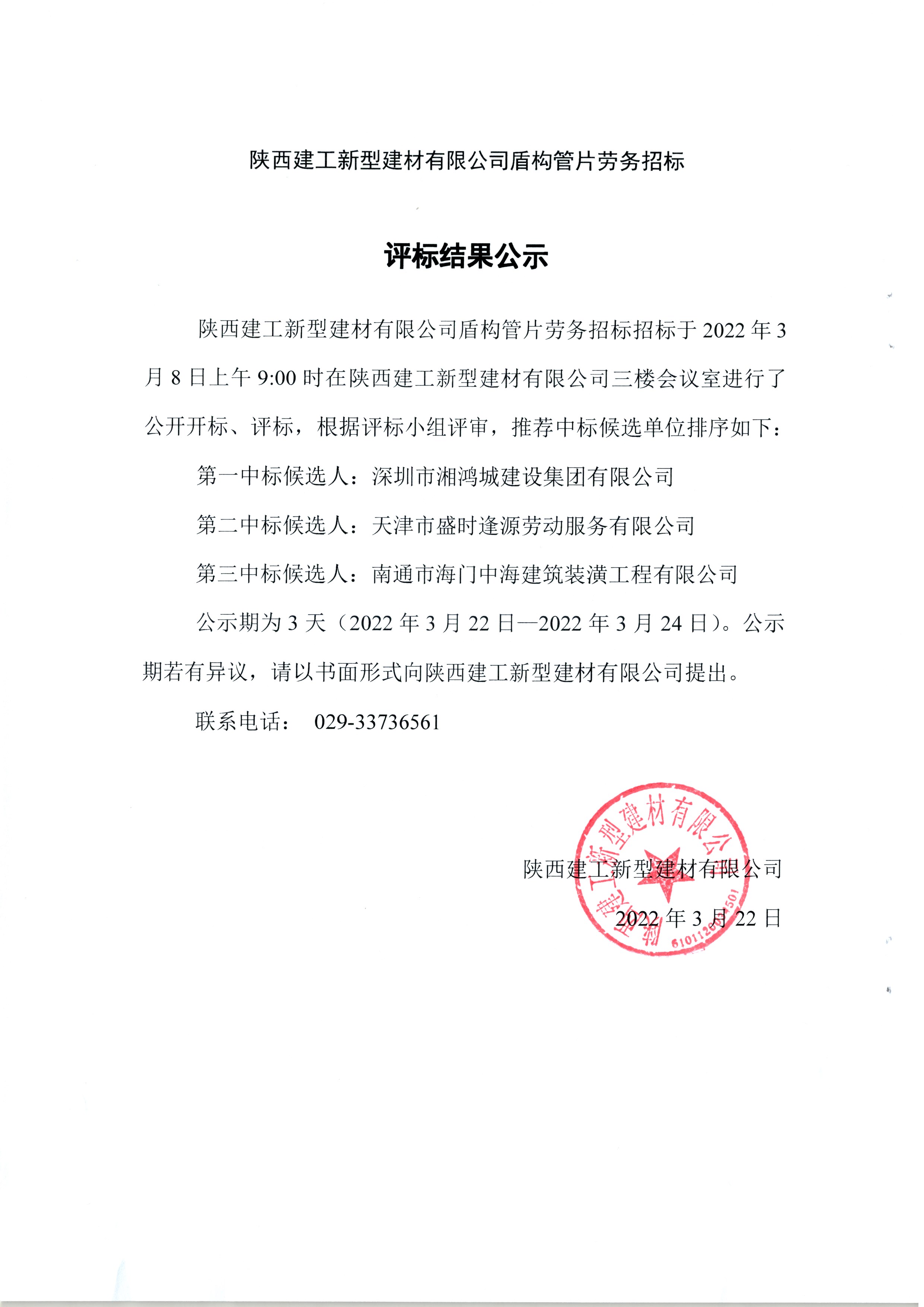 | 陜西建工新型建材有限公司盾構(gòu)管片勞務招標結(jié)果公示 |