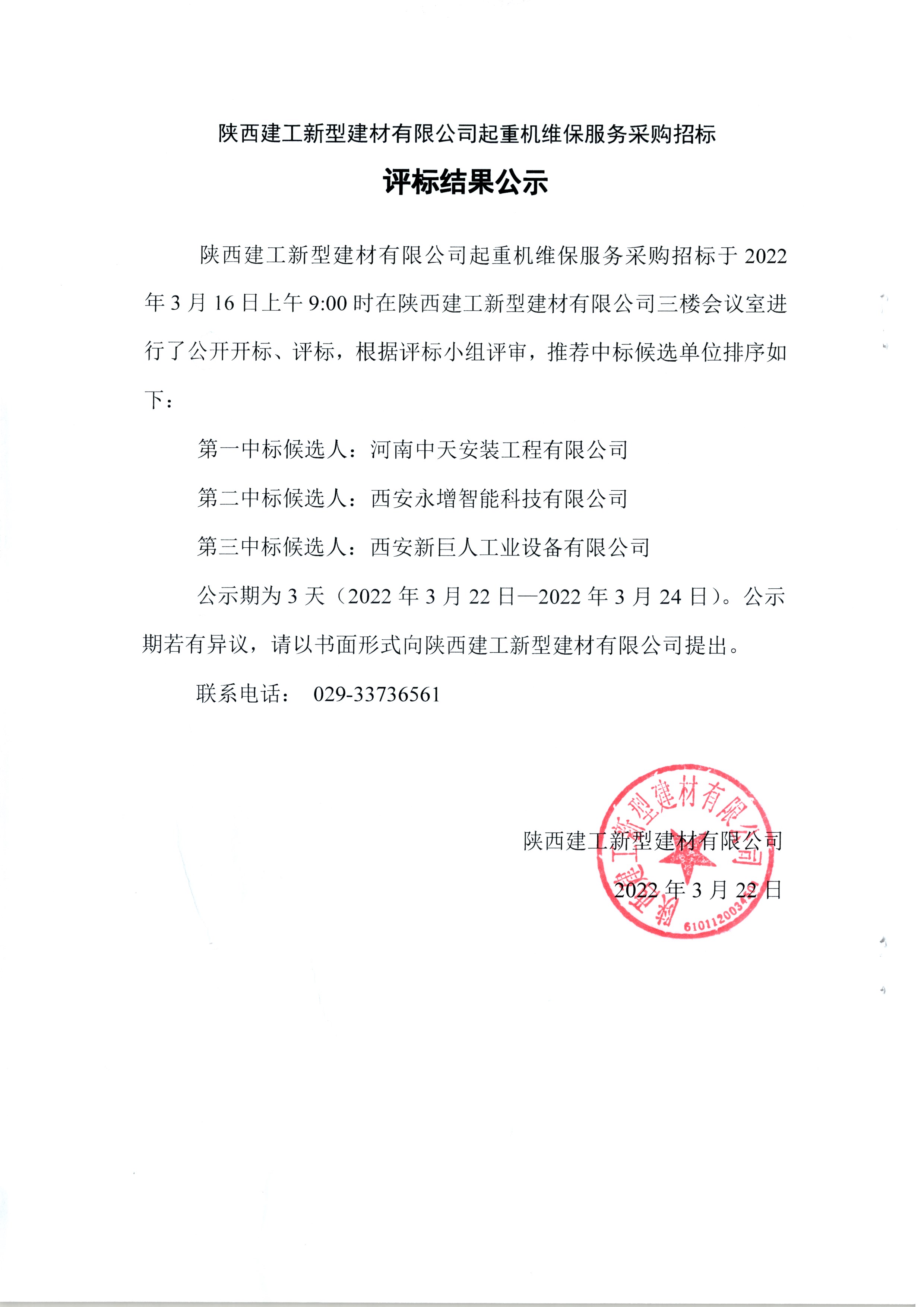 | 陜西建工新型建材有限公司起重機(jī)維保服務(wù)采購(gòu)招標(biāo)結(jié)果公示 |