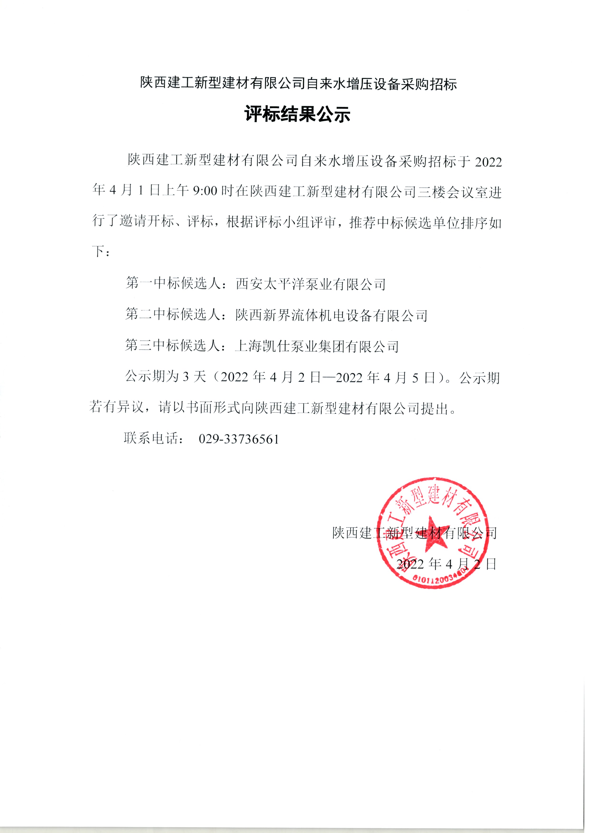 | 陜西建工新型建材有限公司自來(lái)水增壓設(shè)備采購(gòu)招標(biāo)結(jié)果公示 |