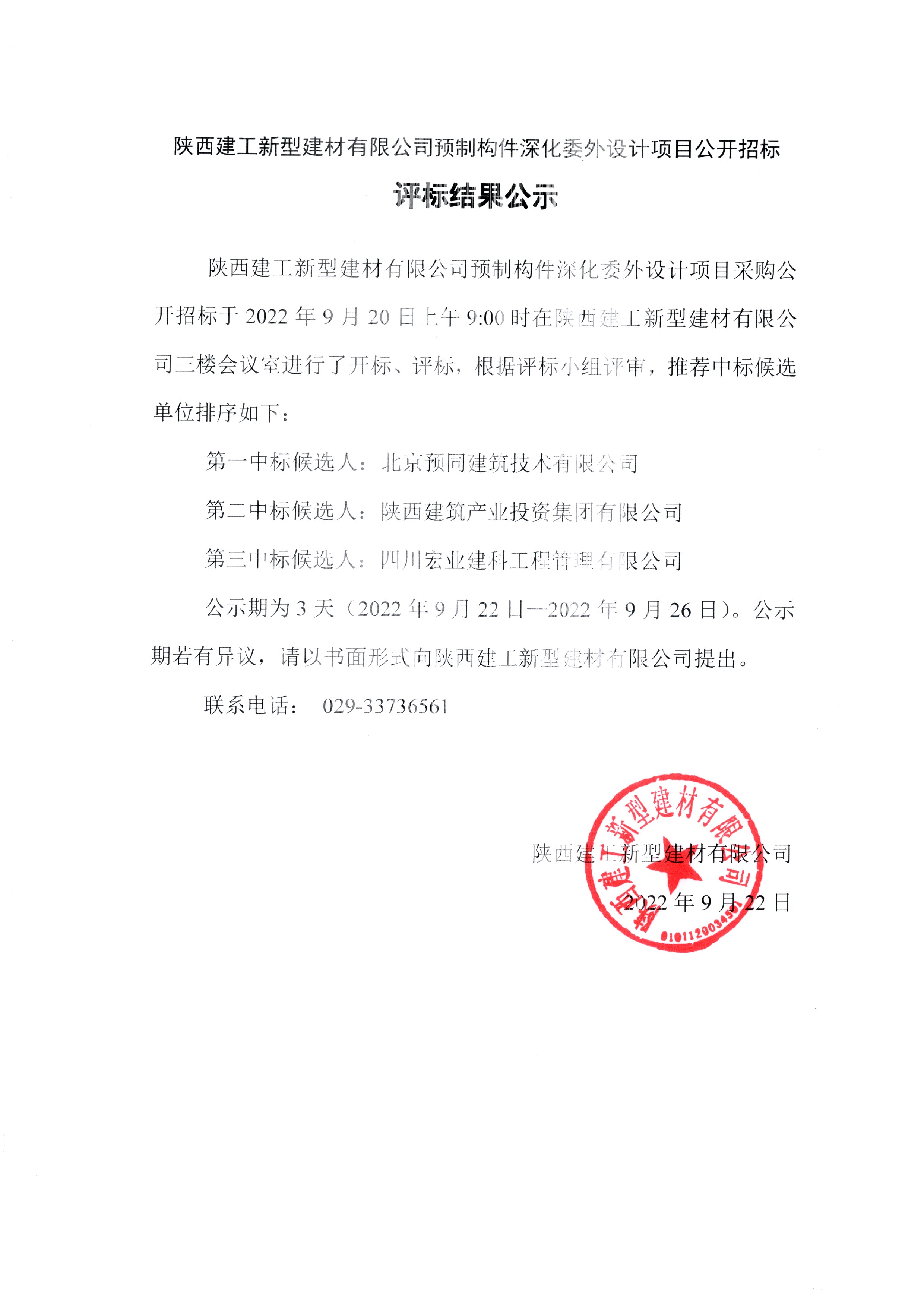 | 陜西建工新型建材有限公司預(yù)制構(gòu)件深化委外設(shè)計(jì)項(xiàng)目評標(biāo)結(jié)果公示 |
