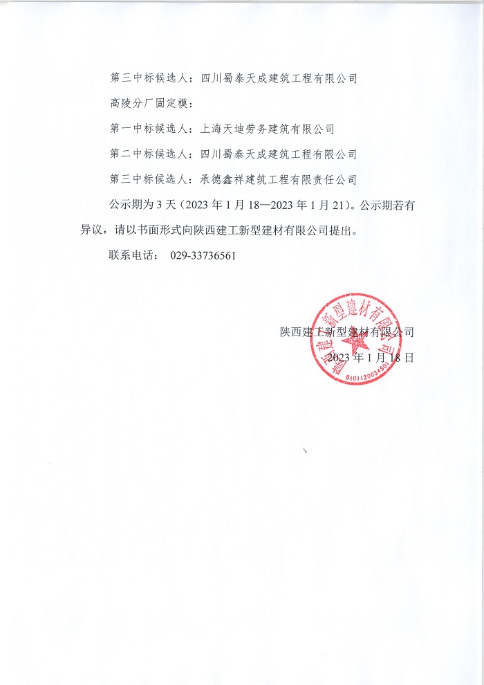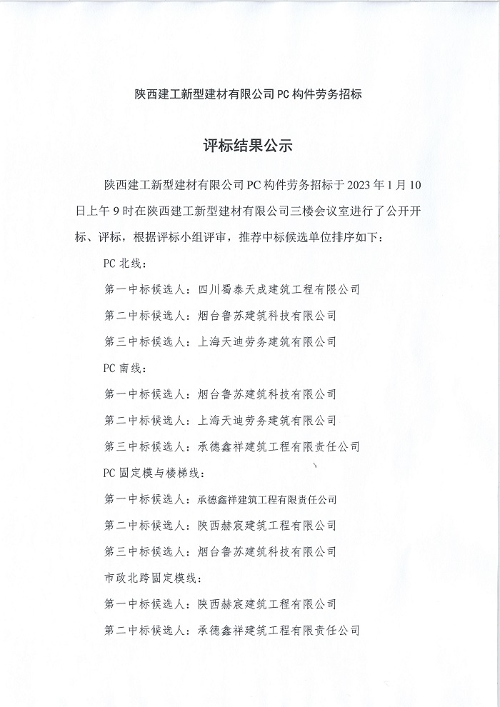 | 陜西建工新型建材有限公司PC構(gòu)件勞務(wù)招標(biāo) 評(píng)標(biāo)結(jié)果公示 |