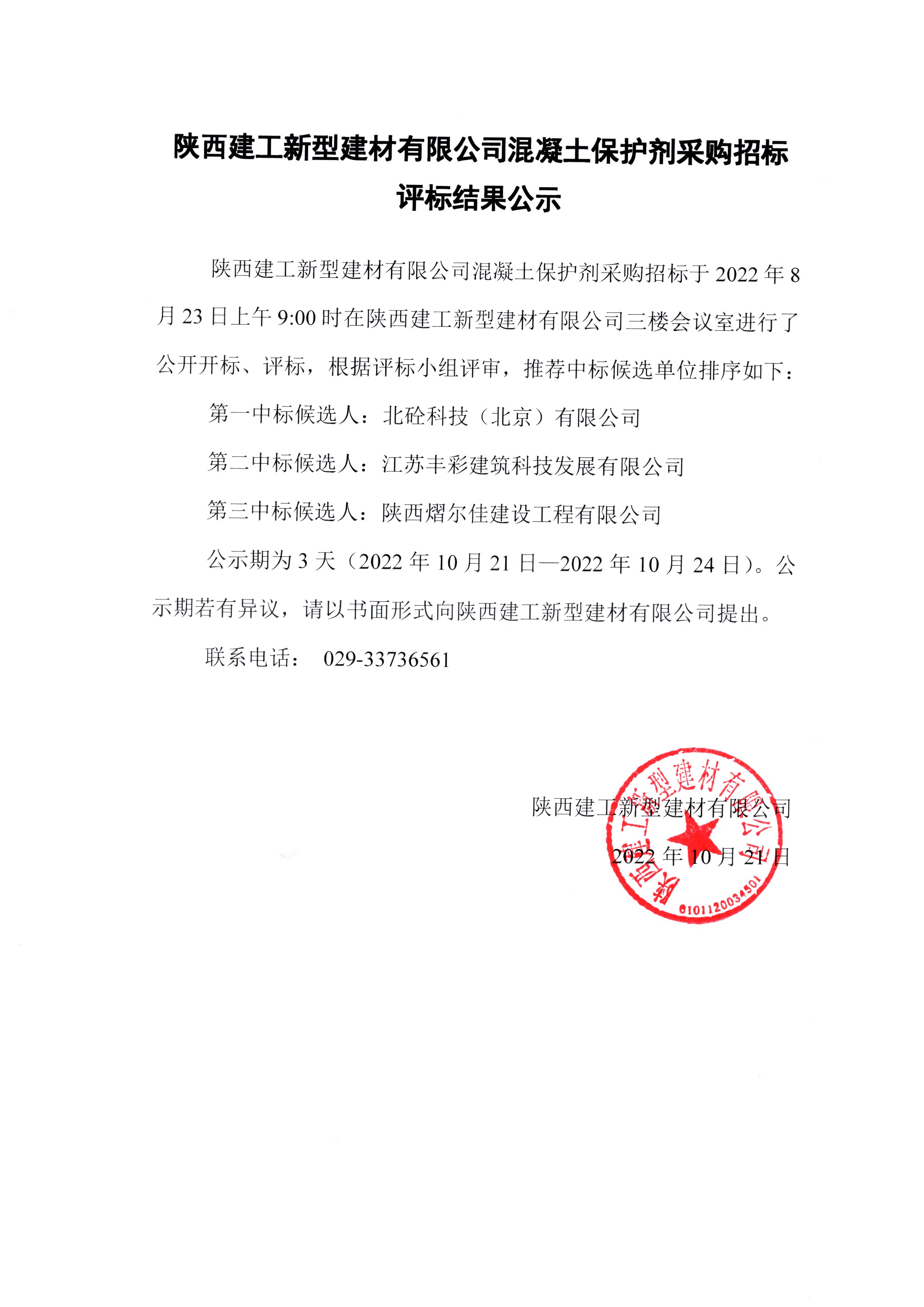 | 陜西建工新型建材有限公司混凝土保護(hù)劑采購招標(biāo)評(píng)標(biāo)結(jié)果公示 |